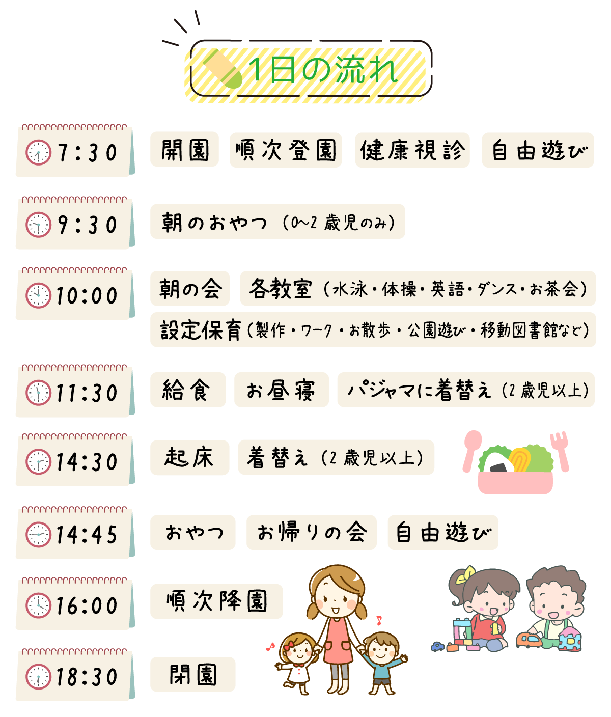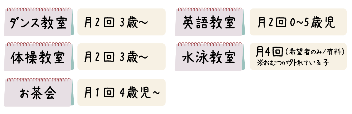 できるだけお子さまがスムーズに活動に参加できるよう9時半までの登園をお願いします。